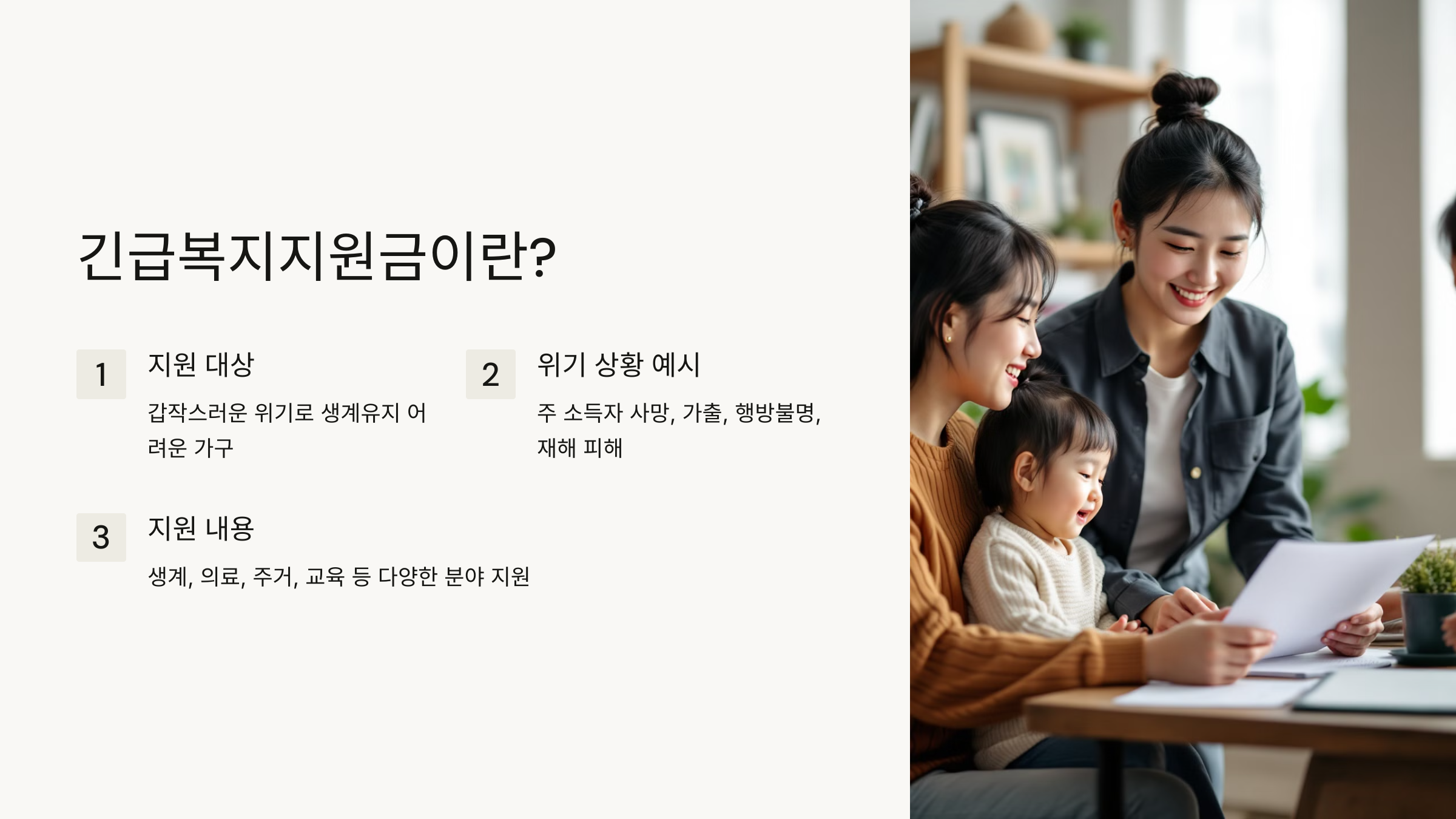 긴급복지지원금은 갑작스러운 위기 상황으로 생계유지가 어려워진 가구를 지원하는 제도입니다. 예를 들어, 주 소득자의 사망, 가출, 행방불명, 구금시설 수용 등으로 인해 생계가 곤란해진 경우, 또는 화재, 자연재해 등으로 주거지가 파손된 경우 등이 해당됩니다. 지원 내용은 다음과 같습니다: