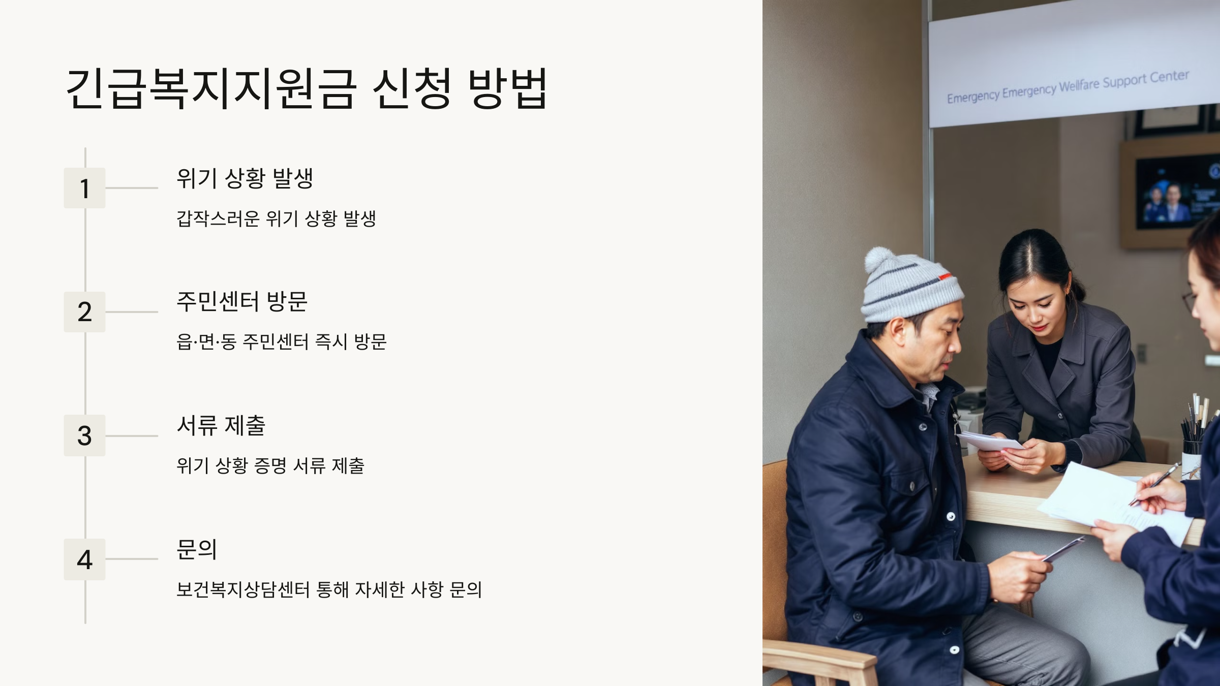 - 생계지원: 4인 가구 기준 월 123만 원