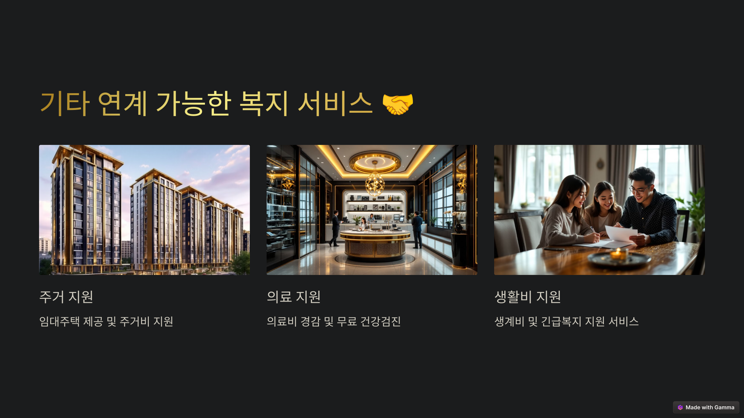 - 생활비 지원: 생계비 지원 및 긴급복지 지원 서비스