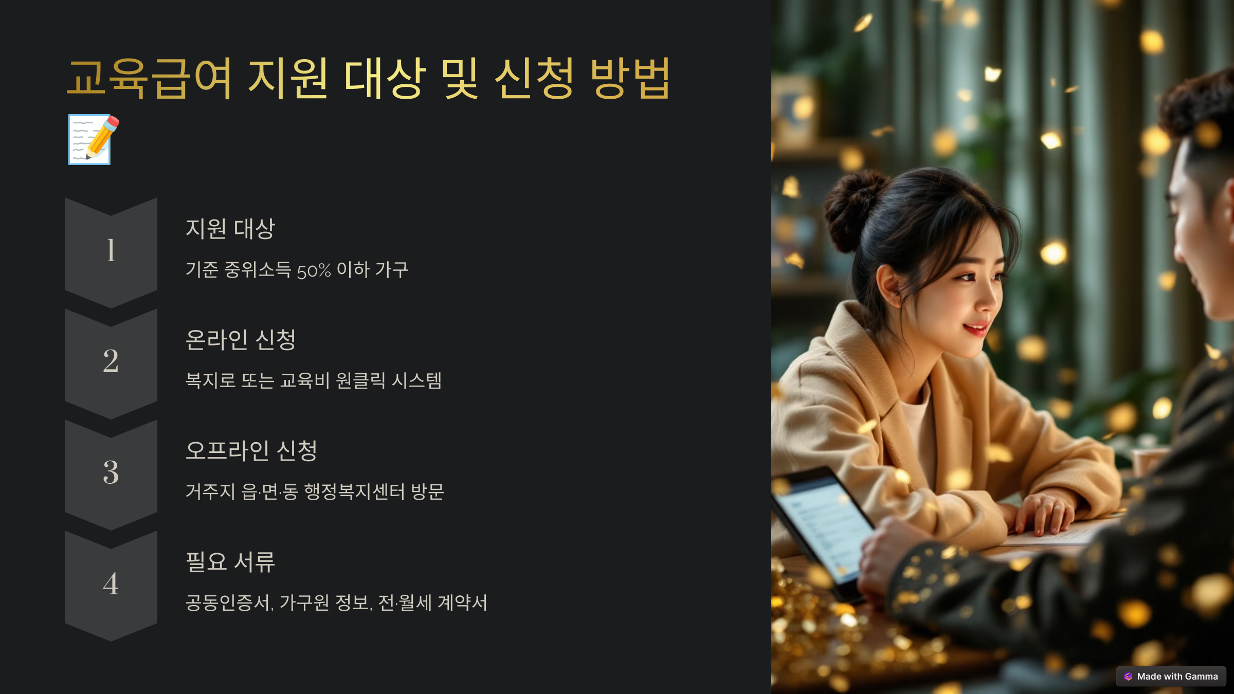 - 온라인 신청: 복지로(https://www.bokjiro.go.kr) 또는 교육비 원클릭 신청 시스템(https://oneclick.neis.go.kr)에서 가능합니다.