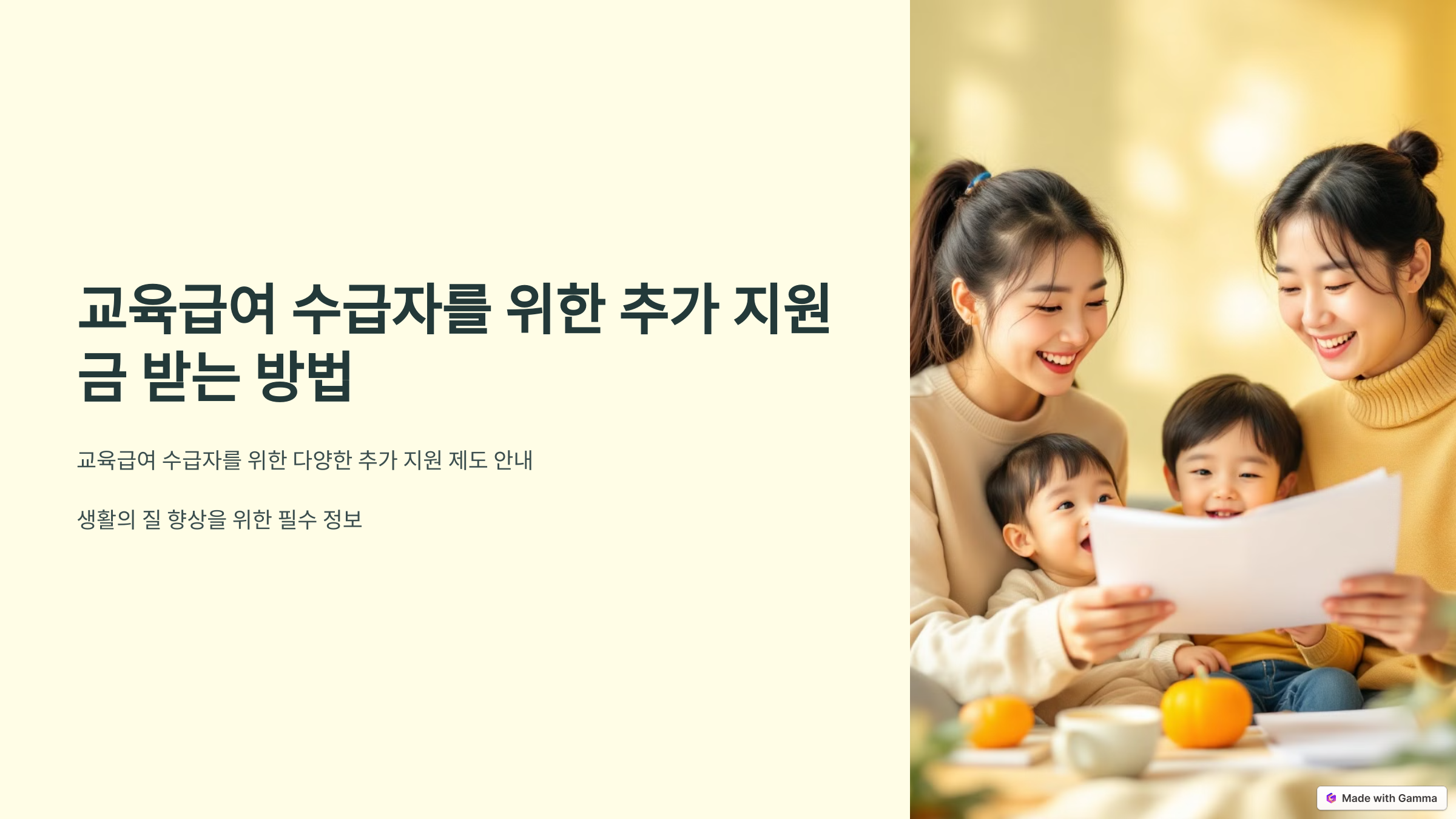 교육급여 수급자는 기본적인 교육지원 외에도 다양한 추가 생활지원금을 받을 수 있습니다. 방과후학교 자유수강권, 교육정보화 지원, 여성청소년 보건위생물품 바우처, 에너지 바우처 등 여러 제도를 적극적으로 활용해 보세요. 또한, 긴급복지 지원제도와 청년·대학생 특별지원 제도를 통해 생활 안정을 도모할 수 있습니다.