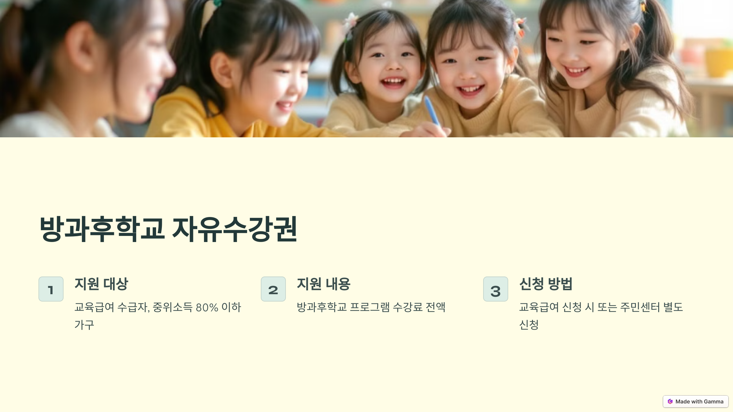 - 지원 내용: 방과후학교 프로그램 수강료 전액 지원
