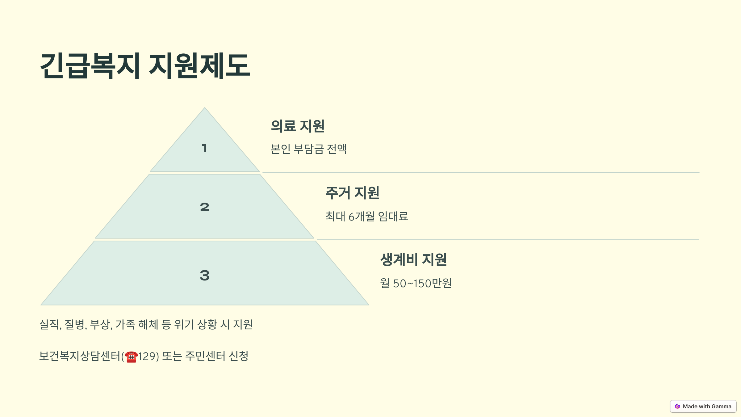 - 지원 대상: 실직, 질병, 부상, 가족 해체 등으로 생계 유지가 어려운 가구