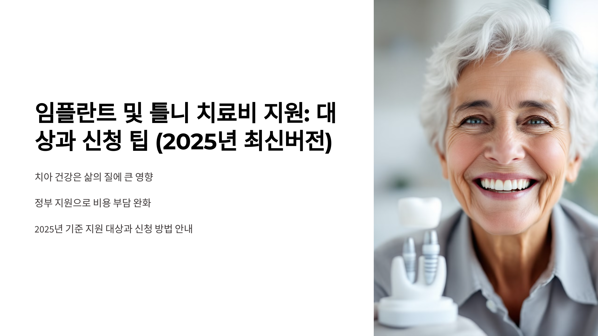치아 건강은 전반적인 삶의 질에 큰 영향을 미칩니다. 특히 임플란트와 틀니는 치아 상실로 인한 불편을 해소하는 중요한 치료법이지만, 비용이 만만치 않아 많은 분들이 부담을 느끼실 텐데요. 다행히도 정부에서는 이러한 부담을 덜어드리기 위해 다양한 지원 제도를 운영하고 있습니다. 이번 글에서는 2025년 기준으로 임플란트와 틀니 치료비 지원 대상과 신청 방법에 대해 자세히 알려드리겠습니다.